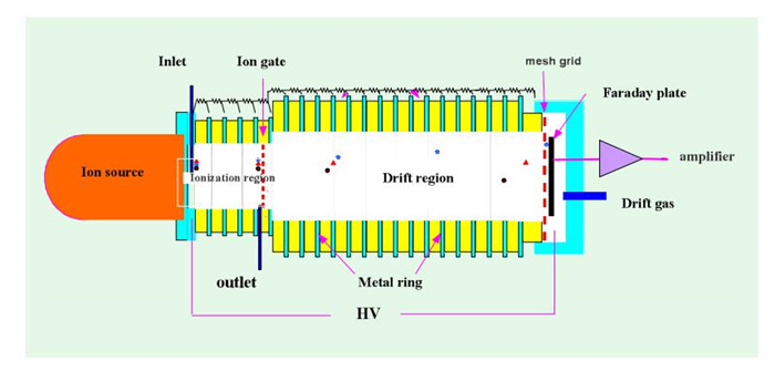 Different sample molecules, after thermally desorbed under high temperature in the sample inlet system, enter the ionization zone of the IMS ion migration tube from the sample inlet for ionization by the ionization source, thus neutral molecules can become ions; Then these ions enter the ion migration zone via the ion gate openeo periodically and reach the Faraday receiving disc for converting into current signals, which, after being amplified by the operational amplifier, will be sen to the data collecting and processing system. These signals are so called IMS detected signals. Different sample molecules form different ratio of ion mass to charge number (mass charge ratio) and therefore the motion velocities are different in the ion migration zone (constant electric field zone) and the time values for reaching the receiving disc are different, too. The IMS can be used to identify the samples based on this migration time difference.