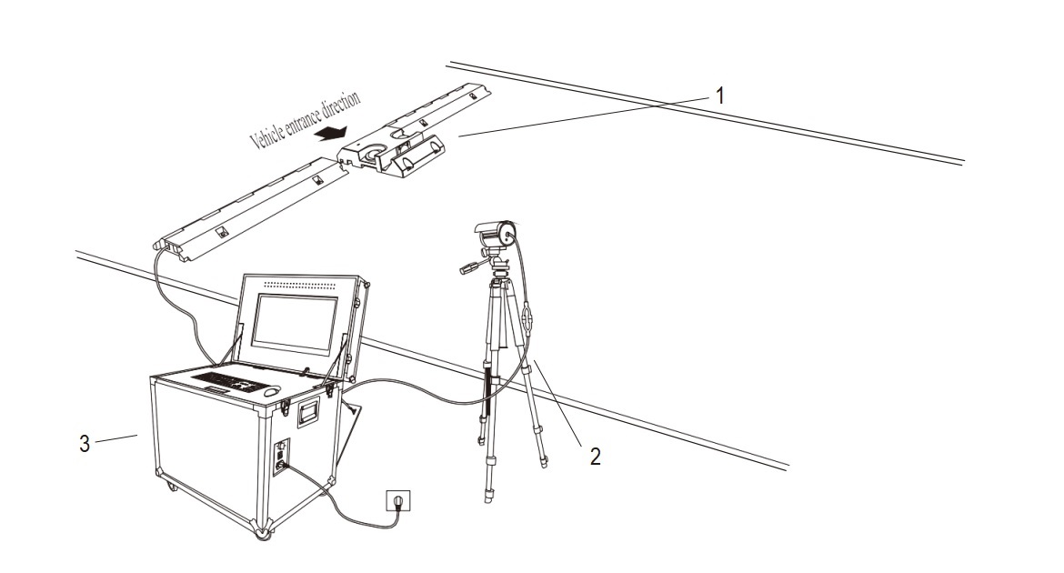 in the distance of 650cm and placed it besides the road and close to the flight case side, which is in the outer edge of the road, the direction of the lens must be toward to center of the under-vehicle scanner.